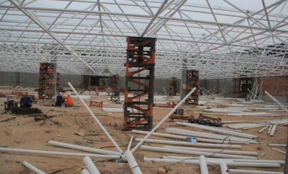 5)总体晋职法:此步履多使用在周边支护以及有多点支护的网架结构,可采取平板升降机、液压千斤顶等小型机具作业巴南施工;